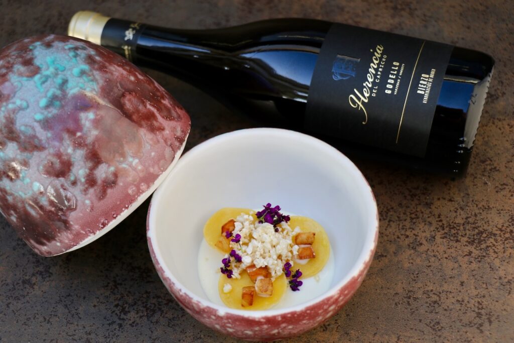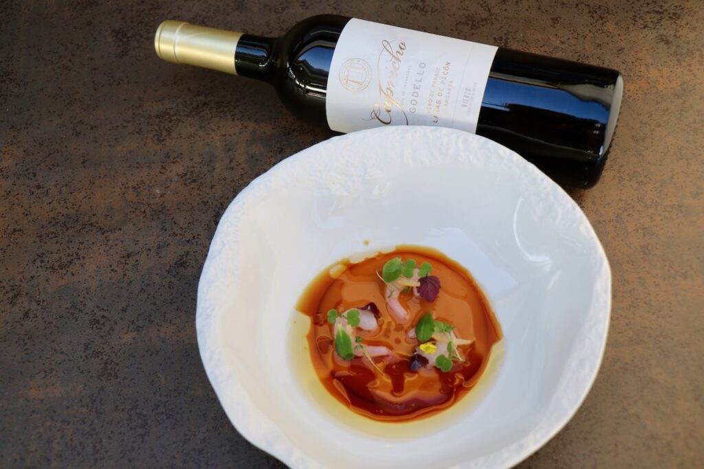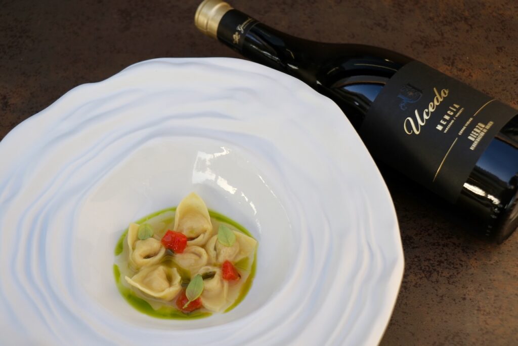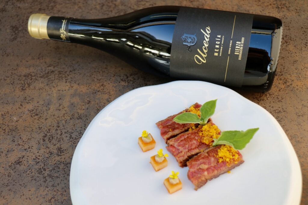 Naveira hará un guiño a la cocina italiana con su `Tortellino in brodo´, y Pavanelli nos llevará a la exclusiva carne japonesa con un `Wagyu, botarga y topinambur fermentado´, ambos platos contarán con la armonía del vino `Ucedo 2022´ elaborado con la variedad Mencía, que los completará con sus notas minerales de pizarra, con notas de fruta negra silvestre, de especias y de regaliz, y en boca descubrirá su agradable confitura de frutas negras (cerezas).