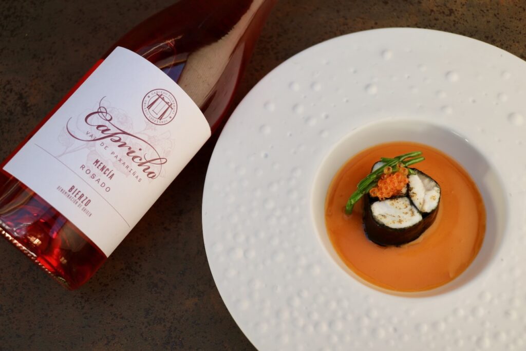 Seguirá la cena con `Lubina botillo y espárrago´ de Samuel Naveira, que se acompañará del vino `Rosado Capricho Val de Paxariñas 2025´, elaborado con la variedad Mencía que aporta en este caso al plato notas de fresas, frutos rojos y rosas.