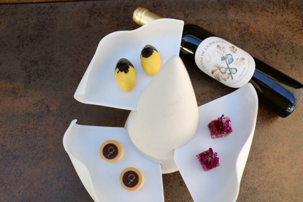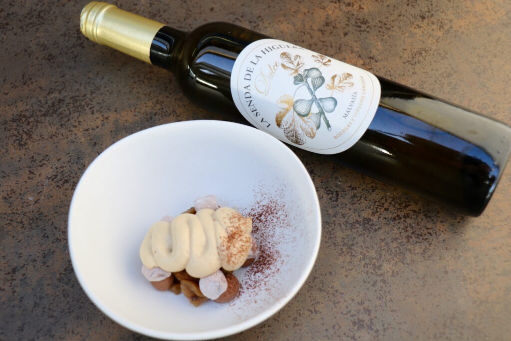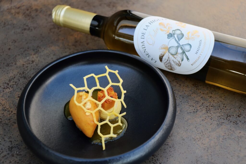 Al llegar al postre Niki Pavanelli ofrecerá su creación `Mango´, y Samuel Naveira su `Tiramiso´, una versión diferente del tradicional postre italiano, tiramisú, en el que el miso es protagonista. Cerraran la cena los `Petit four´ de Niki Pavanelli, con el acompañamiento de toda la parte dulce con el vino `La Senda de la Higuera´, elaborado con la variedad 100% Malvasía, con notas exóticas y minerales con recuerdos a flores blancas, cítricos y miel.