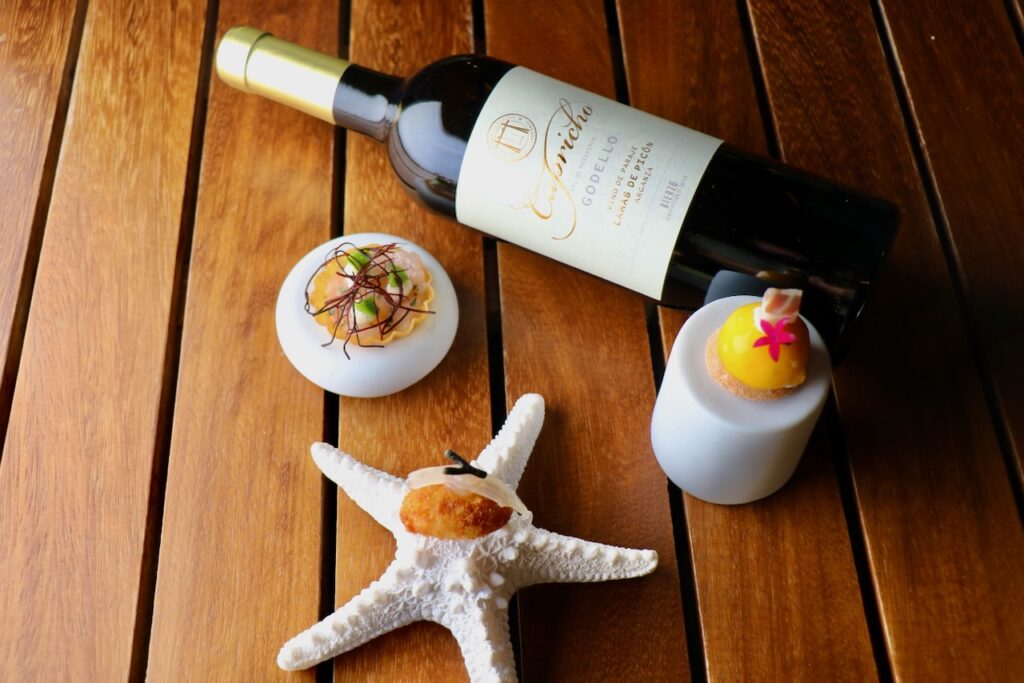 El menú se abrió con `Aperitivos´y `Edén de nuestro océano´ del chef Niki Pavanelli, seguido de `Sashimi Tokio – París´ de Samuel Naveira. Ambos vinos se servirán en armonía con el vino elaborado con la variedad Godello `Capricho Val de Paxariñas 2025´, reconocido por sus notas cítricas, flores blancas y frutas de hueso, albaricoque y melocotón.